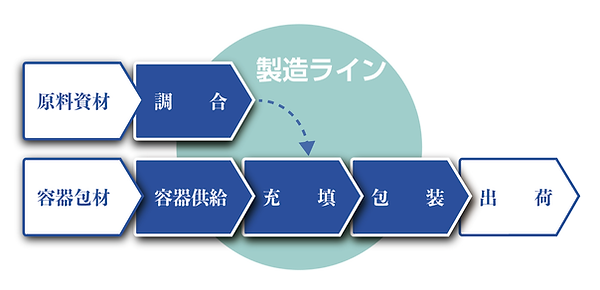資材として納品された容器を製造ラインに供給し、容器内面を洗浄して 充填工程に流します。